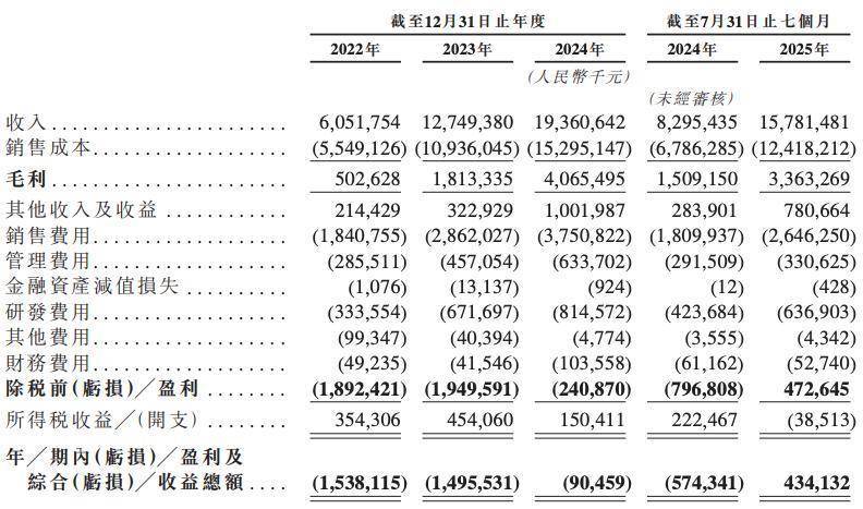 得益于销量的高速增长,岚图汽车收入保持快速增长。报告期内,公司实现营业收入分别为60.5亿元、127.5亿元、193.6亿元、157.8亿元,2022年~2024年复合年增长率为78.9%,2025年前7个月同比增速为90.2%。