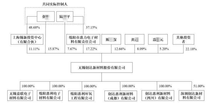 IPO前,创达新材实际控制人张某、陆某平通过直接持股及控制投资平台(锡新投资、绵阳惠力)等方式,合计掌控公司高达51.87%的表决权。张某任董事长兼总经理,陆某平任副董事长兼副总经理,二人均出身于无锡市化工研究设计院。